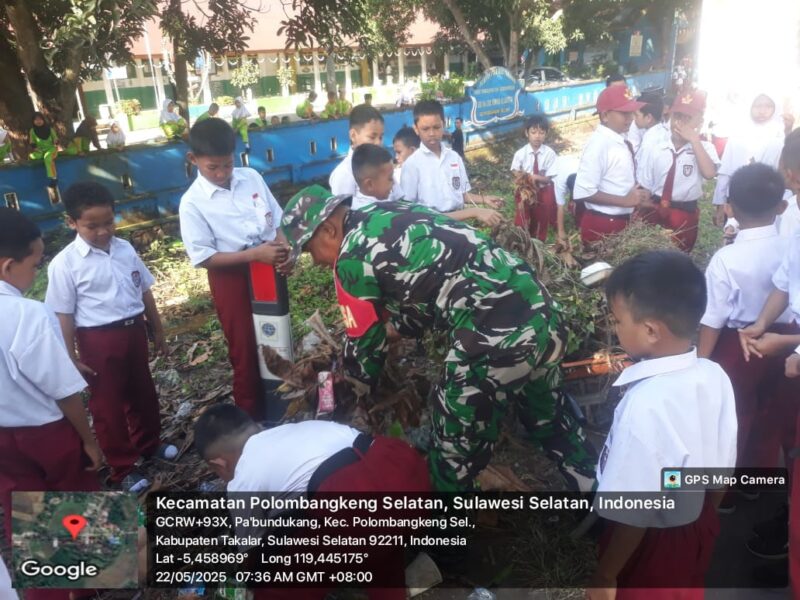 TAKALAR — kriminal24.com|Wujudkan kemanunggalan TNI dengan rakyat, Personel Koramil 1426-02/Polsel, Kodim 1426/Takalar bersama siswa dan guru SD Inpres No.102 Bontokadatto melaksanakan Pembersihan saluran air sepanjang ± 100 meter serta sampah organik dan non organik di depan SD Inpres No.102 Bontokadatto Kelurahan Bontokadatto Kecamatan Polsel Kabupaten Takalar. Kamis 22/05/2025.