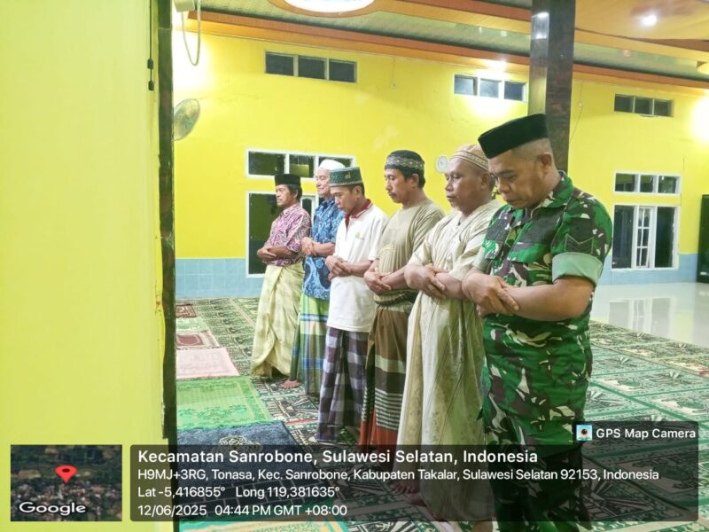 TAKALAR — kriminal24.com|Tingkatkan keimanan dan ketaqwaan kepada Allah SWT, Personel Koramil 1426-06/Mapsu, Kodim 1426/Takalar, melaksanakan kegiatan safari Sholat Subuh berjamaah dengan menggilir tiga Masjid wilayah binaan kali ini giliran Masjid Nurul Ibrahim, Masjid Nurul Ihsan dan Masjid Nurul Muhajirin Kecamatan Mapsu dan Sanrobone Kabupaten Takalar. Kamis, (12/06/2025)
