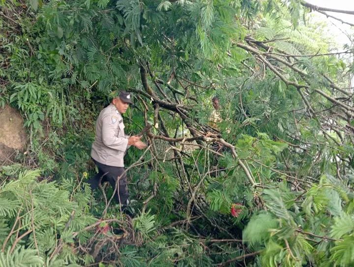 Tanpa menunggu waktu lama, petugas personil Polsek Simpang Empat, melakukan Pemotongan dan Membersihan Ranting pohon yang menutup akses jalan.
