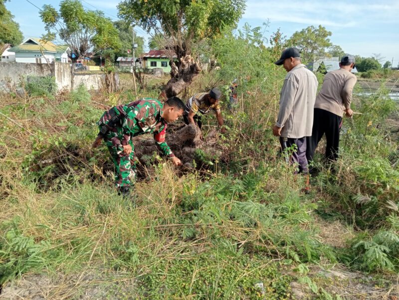 Personel Koramil 1426-05/Marbo bersama pemerintah setempat dan warga nampak kompak bahu membahu saling bekerjasama membersihkan saluran air dan rumput liar yang sudah rimbun dan sangat menggangu pemandangan.