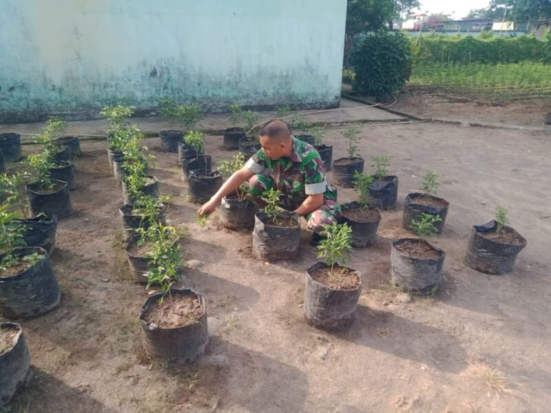 TAKALAR – kriminal24.com|Piket Koramil 1426-07/Pattallassang, Kodim 1426/Takalar, tampak sedang merawat tanaman yang memanfaatkan lahan kosong dengan menanami tanaman produktif. Halaman Kantor Koramil disulap menjadi lahan pertanian dengan membuat bedengan/rak polibag, dan Kolam ikan yang diisi dengan berbagai jenis tanaman dan ikan. Kamis, (17/07/2025)