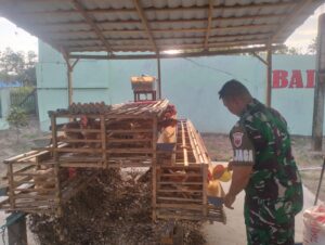 TAKALAR – kriminal24.com|Piket Makodim 1426/Takalar, Serda Amiruddin tampak sedang merawat tanaman, memberi makanan pada ikan dan ayam petelur yang memanfaatkan lahan kosong di Pekarangan Kantor Kodim 1426/Takalar Kelurahan Kalabbirang Kecamatan Pattallassang Kabupaten Takalar. Rabu, (03/09/2025)
