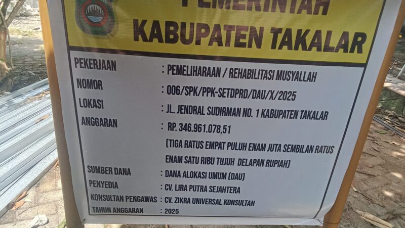 Takalar – Kriminal24.com | Sejumlah pekerja proyek rehabilitasi musallah di Jl. Jendral Sudirman No. 1, Kabupaten Takalar, terpantau tidak menggunakan alat keselamatan kerja (APD) saat kegiatan berlangsung. Proyek yang bersumber dari Dana Alokasi Umum (DAU) dengan nilai anggaran Rp 346.961.078,51, dikerjakan oleh CV. Lira Putra Sejahtera dan diawasi oleh CV. Zikra Universal Konsultan ini menuai sorotan dari masyarakat setempat.