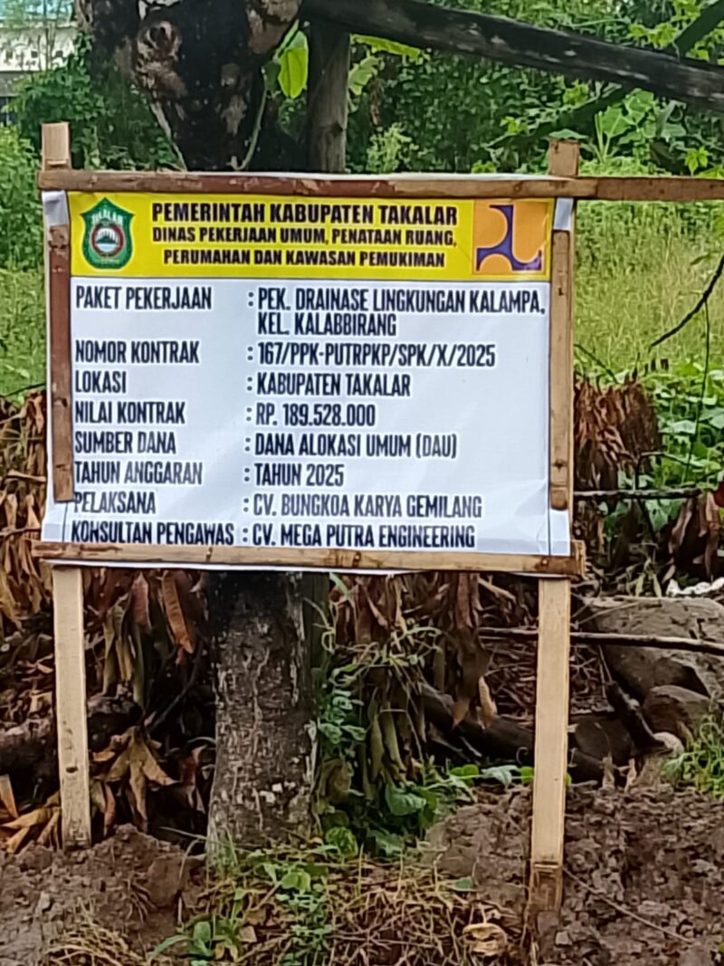 Takalar I Kriminal24.com – Proyek pembangunan drainase di lingkungan kalampa Kelurahan Kalabbirang, Kecamatan Pattalassang, Kabupaten Takalar, dengan nilai anggaran Rp 189.528.000, yang dikerjakan oleh CV. Bungkoa Karya Gemilang, kini menjadi sorotan tajam dari berbagai pihak. Temuan ini mencuat setelah investigasi yang dilakukan oleh tim media dan beberapa lembaga sosial kontrol di Takalar.
