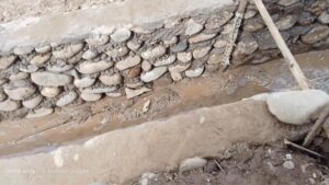 Pantauan visual menunjukkan beberapa ruas pondasi tampak diletakkan langsung di atas tanah yang masih basah dan berlumpur, tanpa galian memadai yang umumnya dibutuhkan untuk konstruksi saluran bertingkat batu. Kondisi ini menimbulkan dugaan bahwa pekerjaan dilakukan tidak sesuai spesifikasi teknis maupun standar konstruksi yang semestinya diterapkan.