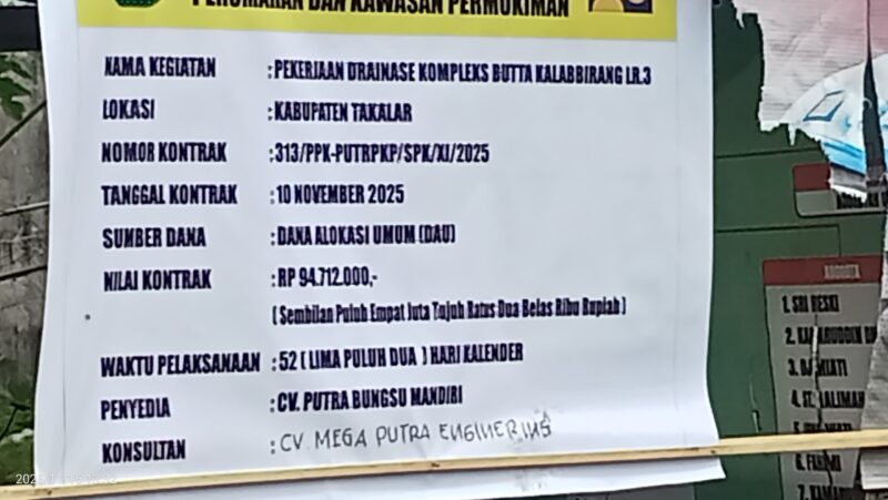 Berdasarkan papan informasi proyek, kegiatan ini berada di bawah Dinas Perumahan dan Kawasan Permukiman Kabupaten Takalar, dengan nilai kontrak sebesar Rp 94.712.000 melalui sumber dana DAU. Pekerjaan dilaksanakan selama 52 hari kalender oleh CV Putra Bungso Mandiri, dengan konsultan CV Mega Putra Engineering. Namun, meski memiliki pagu dan waktu pengerjaan yang jelas, kondisi di lapangan dinilai tidak sejalan dengan harapan masyarakat,(17/11/2025)–