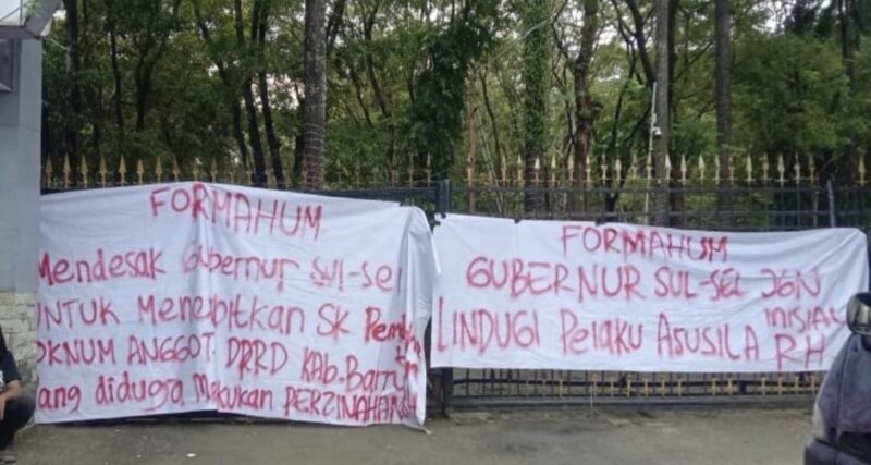 Dalam aksinya, massa membawa spanduk berisi tuntutan agar Gubernur Sulsel tidak melindungi oknum dewan yang diduga terlibat kasus asusila tersebut,Senin(17/11/2025)–