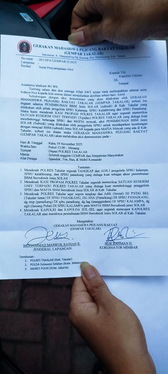 Takalar l Kriminal24.com –  Gerakan mahasiswa pejuang rakyat (Gempar Takalar) sorot dugaan penimbunan BBM jenis solar subsidi Takalar dilakukan pihak pengelola SPBU kalampa , SPBU Kalakbirang, SPBU Panaikang , ungkap tertulis dalam suratnya bertanda tangan Jendral lapangan mabruk Raihan il &kordinator lapangan Nur Rahman H