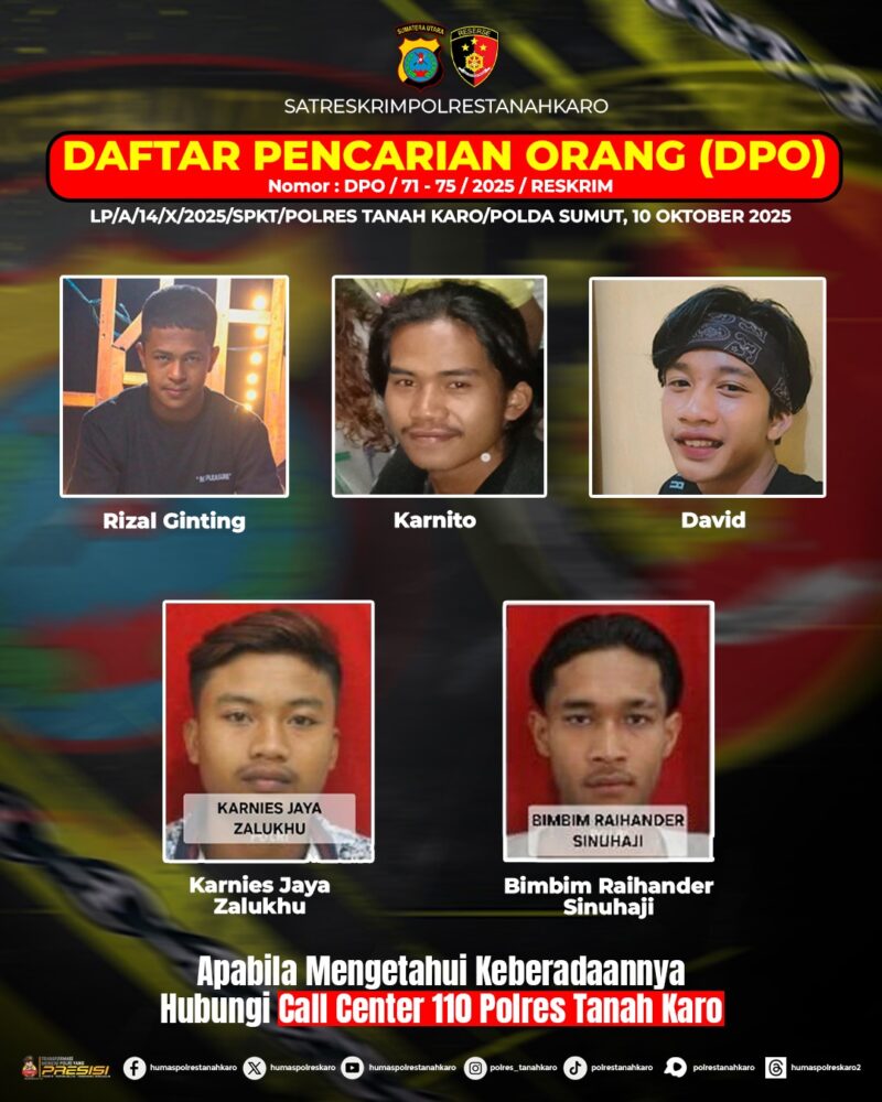 Melalui penerbitan DPO resmi Polres Tanah Karo, meminta masyarakat menghubungi Call Center 110 apabila memiliki informasi terkait salah satu dari kelima nama tersebut.