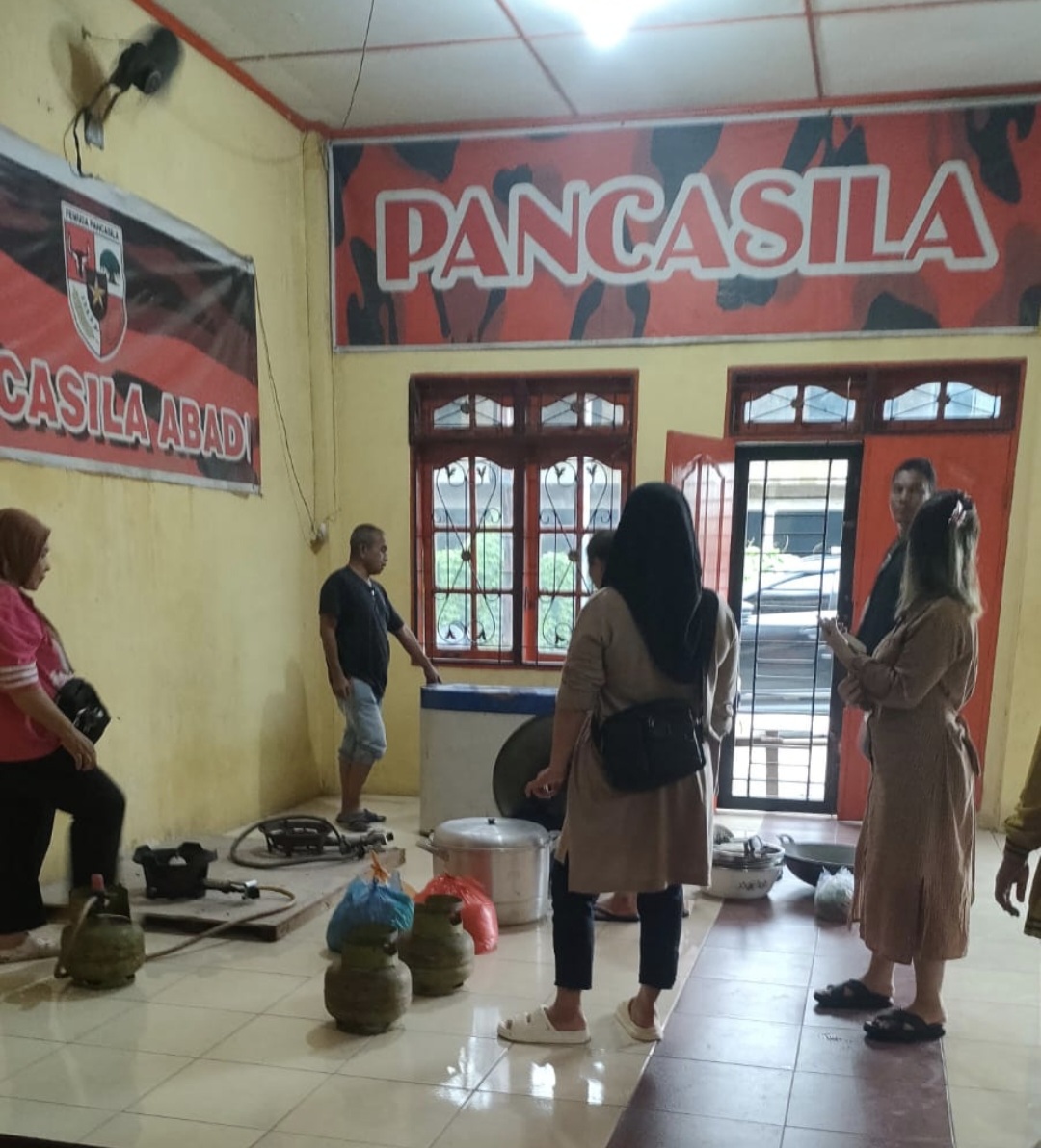 Sejumlah relawan dan kader Pemuda Pancasila memasak bersama sejak pagi, menyiapkan puluhan hingga ratusan porsi untuk dibagikan.