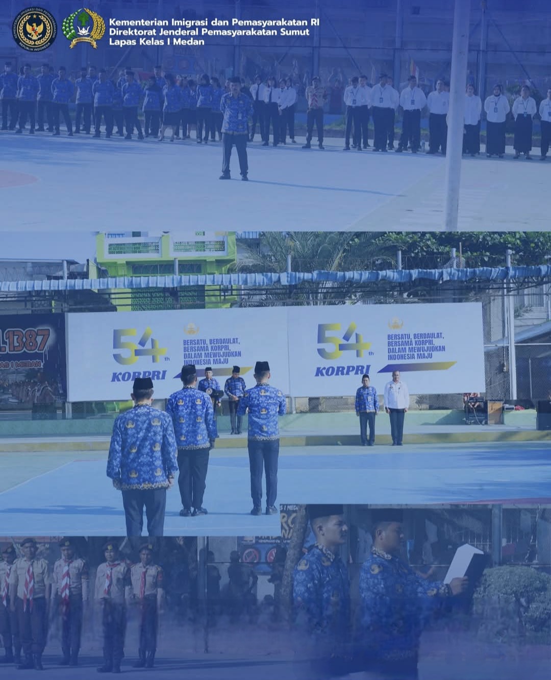 Medan – Lapas Kelas I Medan menyelenggarakan Upacara Peringatan Hari Ulang Tahun ke-54 KORPRI Tahun 2025. Upacara berlangsung khidmat di halaman depan Lapas Kelas I Medan dan dihadiri seluruh pegawai serta pejabat struktural, pada Senin (01/12).