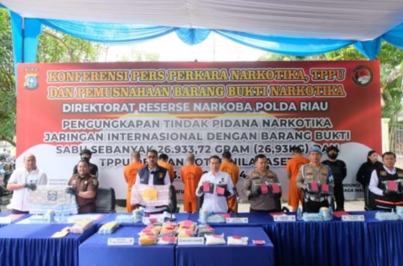 PEKANBARU – Direktorat Reserse Narkoba Polda Riau akhirnya memusnahkan barang bukti narkotika berupa 27 paket besar sabu seberat 26,9 kilogram hasil pengungkapan jaringan peredaran internasional yang dikendalikan seorang bandar dari dalam lapas.