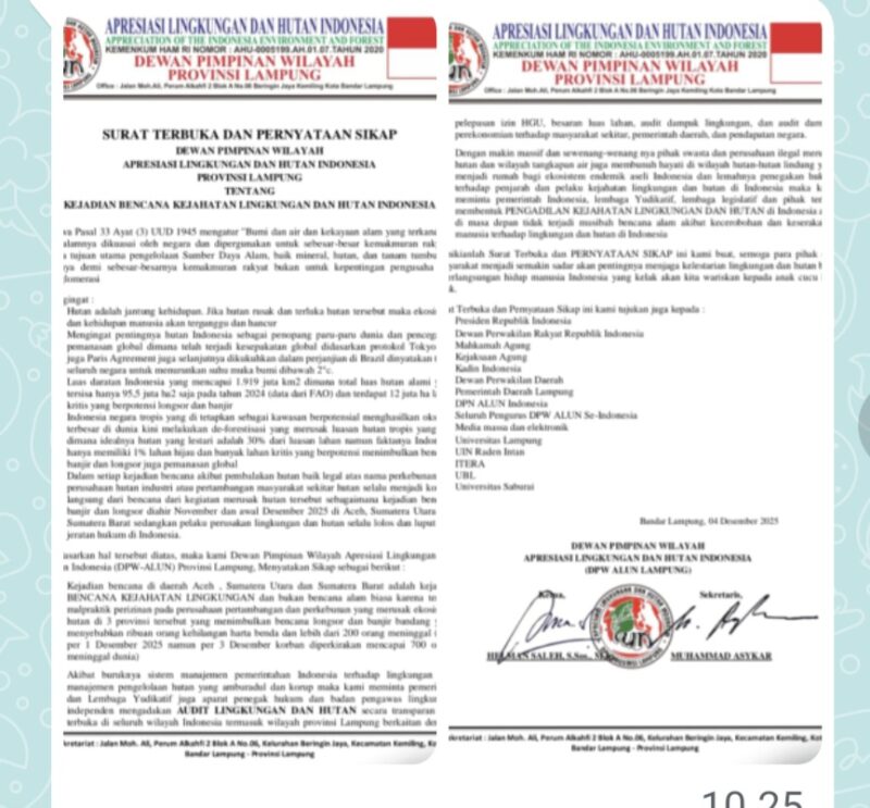 Ketua DPW ALUN Lampung Helman Saleh didampingi Sekretaris Muhammad Asykar menyampaikan kekhawatiran nya atas bencana Alam yang terjadi di Indonesia sampai saat ini, atas dasar peristiwa tersebut DPW ALUN Provinsi Lampung membuat Surat Terbuka dan Pernyataan Sikap, Kamis (04/12/2025).