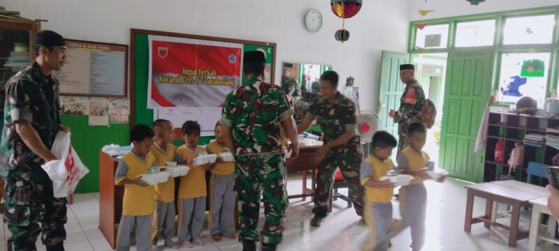 Takalar l Kriminal24.com – Personel Koramil 1426-07/Pattallassang, Kodim 1426/Takalar kembali melaksanakan kegiatan Jum’at berkah, membagikan paket nasi dus untuk para Siswa-siswi sekolah Taman Kanak-kanak Milenium Kirana di Kelurahan Bajeng, Kecamatan Pattallassang, Kabupaten Takalar. Jum’at, 19/12/2025.