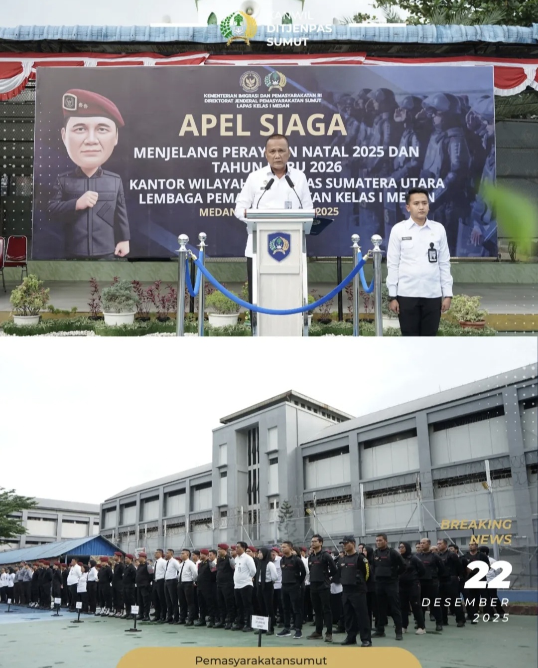 Kantor Wilayah Direktorat Jenderal Pemasyarakatan (Ditjenpas) Sumatera Utara melaksanakan Apel Siaga Natal dan Tahun Baru (Nataru) sebagai langkah strategis dalam memperkuat pengamanan serta menjaga stabilitas keamanan dan ketertiban pemasyarakatan di wilayah Sumatera Utara, Senin (22/12/2025).