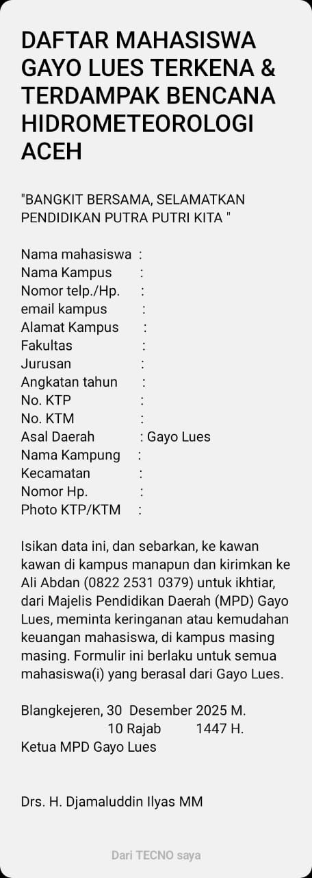 MPD Gayo Lues berharap seluruh pihak—mahasiswa, keluarga, tokoh masyarakat, serta lembaga pendidikan—dapat bersinergi demi memastikan tidak ada satu pun mahasiswa Gayo Lues yang terpaksa berhenti kuliah akibat musibah.