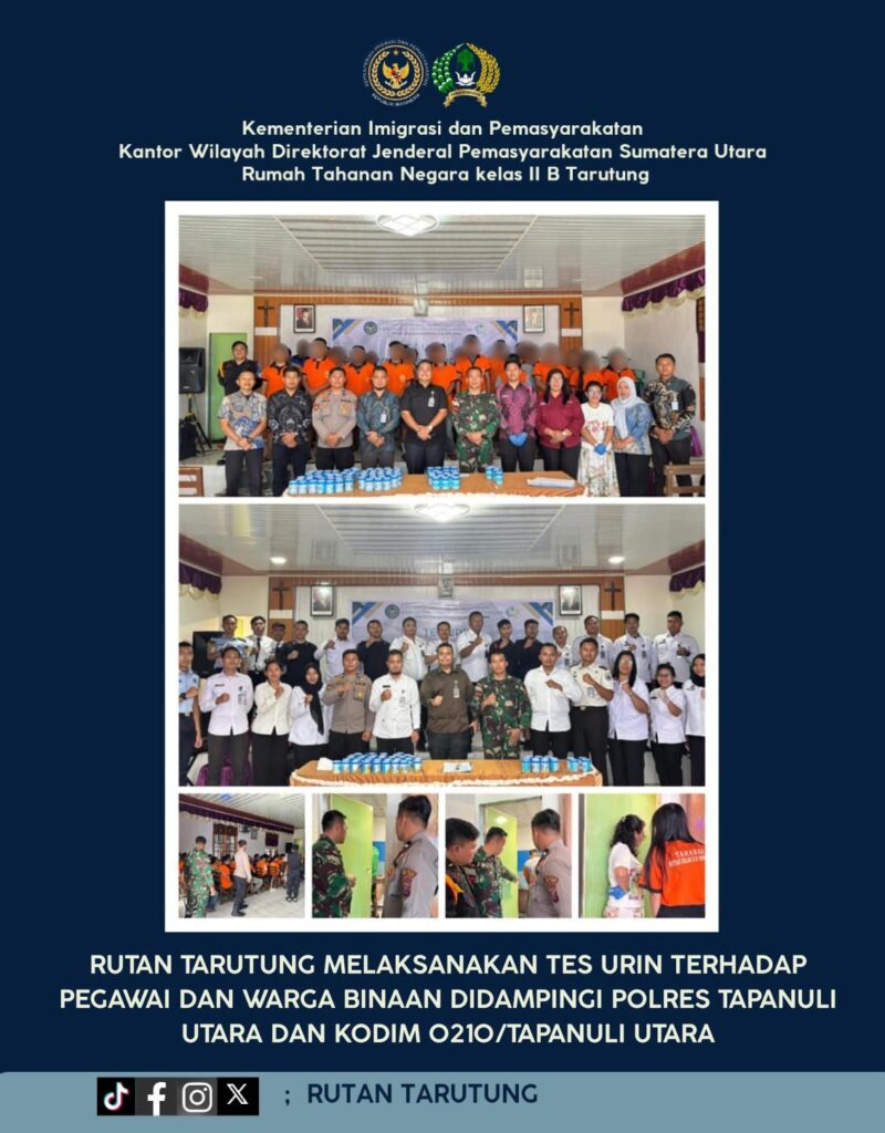 Kegiatan tes urine tersebut dihadiri langsung oleh Kepala Rumah Tahanan Negara Kelas IIB Tarutung, Evan Yudha Putra Sembiring, Kasubsi Pengelolaan, Mian H.R. Simarmata, Kasubsi Pelayanan Tahanan, Jonias B. Pakpahan serta seluruh jajaran Pegawai Rutan Kelas IIB Tarutung. Pelaksanaan kegiatan berlangsung tertib, transparan, dan akuntabel sebagai bentuk komitmen nyata mewujudkan Rutan yang bersih dari narkoba.