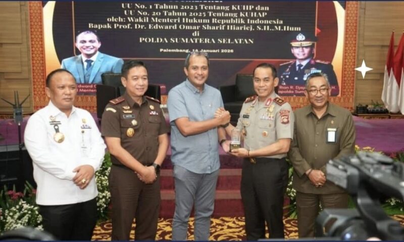 Kepala Kantor Wilayah Kementerian Hukum Sumatera Selatan, Maju Amintas Siburian menghadiri kegiatan Sosialisasi Undang-Undang Nomor 1 Tahun 2023 tentang KUHP dan Undang-Undang Nomor 20 Tahun 2025 tentang KUHAP, Rabu (14/1).