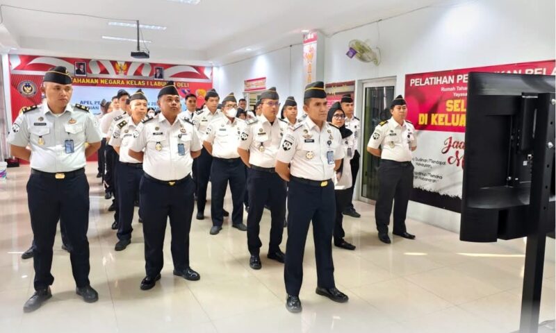 Labuhan Deli — Rumah Tahanan Negara (Rutan) Kelas I Labuhan Deli mengikuti Apel Bersama Awal Tahun 2026 di lingkungan Kementerian Koordinator Bidang Hukum, Hak Asasi Manusia, Imigrasi, dan Pemasyarakatan yang dilaksanakan secara virtual, Senin (12/1/2026). Kegiatan ini diikuti dari Ruang Moralitas Lantai 2 Rutan Kelas I Labuhan Deli dengan penuh khidmat dan disiplin.