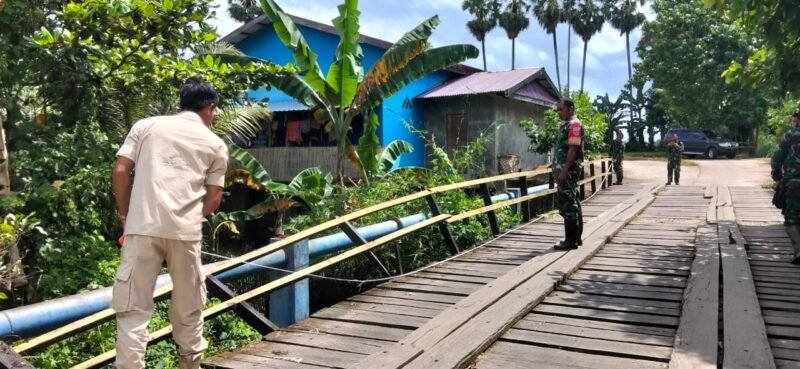 Dilokasi terlihat, Serma Aminullah bersama Anggota Zidam melakukan pengukuran panjang dan lebar jembatan dengan menggunakan alat ukur manual. Sebagian struktur jembatan tampak rapuh dan terbuat dari papan kayu yang sudah menua, berada tepat di atas aliran sungai kecil yang arusnya cukup aktif.