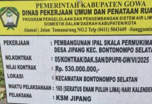GOWA – Kriminal24.com | Pembangunan Instalasi Pengolahan Air Limbah (IPAL) skala permukiman di Desa Jipang, Kecamatan Bontonompo Selatan, Kabupaten Gowa, menuai sorotan tajam dari publik. Proyek yang menelan anggaran negara sebesar Rp 530 juta tersebut diduga kuat dikerjakan tidak sesuai spesifikasi teknis, sehingga memunculkan kekhawatiran serius terkait mutu konstruksi dan keberlanjutan fungsi IPAL ke depan, Selasa (21/01/2026)