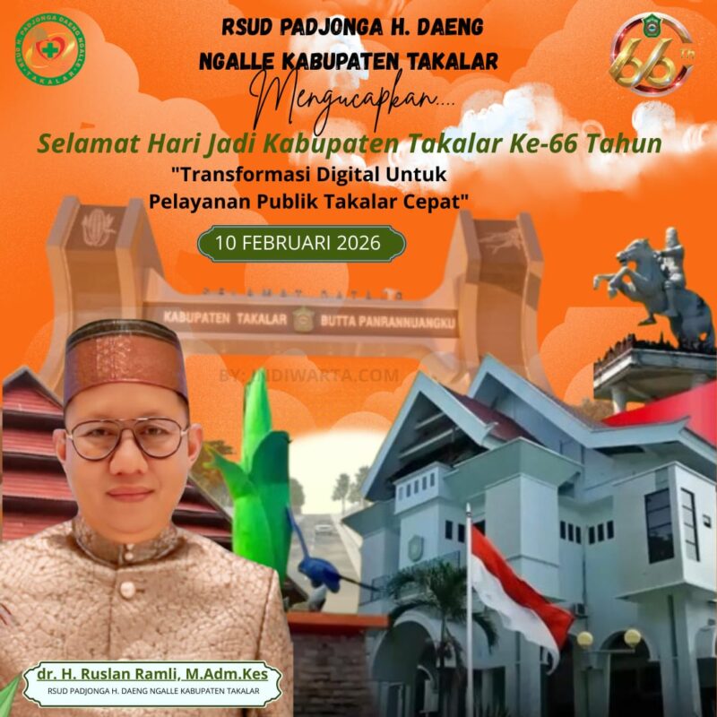 Takalar –  Kriminal24.com | Direktur RSUD H. Padjonga Daeng Ngalle Kabupaten Takalar, dr. H. Ruslan Ramli, M. Adm. Kes, menyampaikan ucapan selamat dan apresiasi mendalam atas Hari Jadi Kabupaten Takalar ke-66. Momentum ini dinilai sebagai tonggak penting dalam perjalanan panjang pembangunan daerah yang dikenal dengan julukan Butta Panrannuangku.