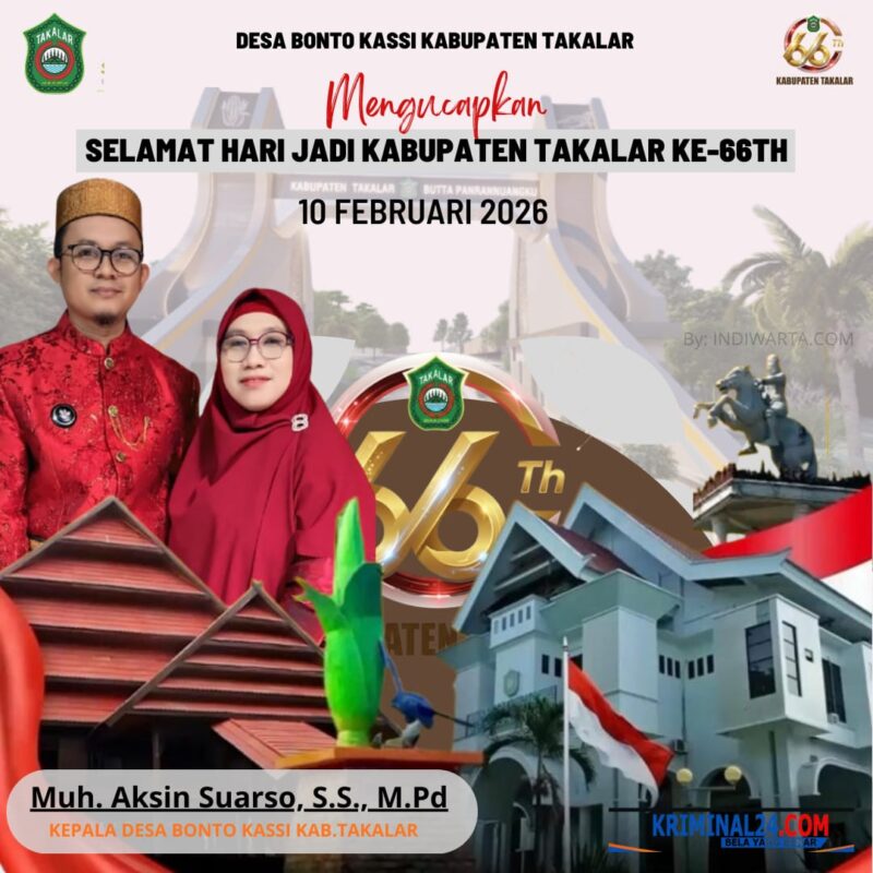 Takalar – Kriminal24.com | Kepala Desa Bonto Kassi, Kecamatan Galesong Selatan, Kabupaten Takalar, Muh. Aksin Suaro, S.S., M.Pd, menyampaikan ucapan selamat dan apresiasi atas peringatan Hari Jadi Kabupaten Takalar ke-66 yang jatuh pada tahun ini. Momentum hari jadi tersebut dinilai sebagai refleksi perjalanan panjang daerah dalam membangun dan melayani masyarakat.