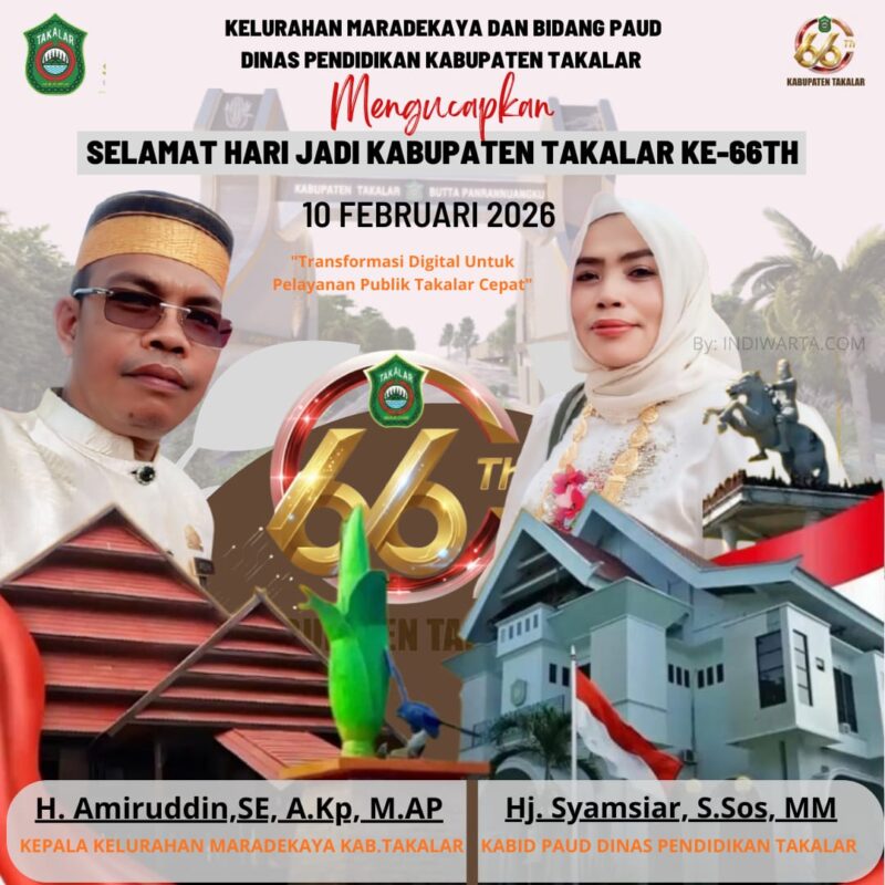 Takalar – Kriminal24.com | Dalam rangka memperingati Hari Jadi Kabupaten Takalar ke-66, Lurah Maradekaya H. Amiruddin, S.E., A.Kp., M.AP bersama Kabid PAUD Dinas Pendidikan Kabupaten Takalar, Hj. Syamsiah, S.Sos., MM, menyampaikan ucapan selamat dan apresiasi atas perjalanan panjang Kabupaten Takalar yang terus tumbuh dan berkembang.
