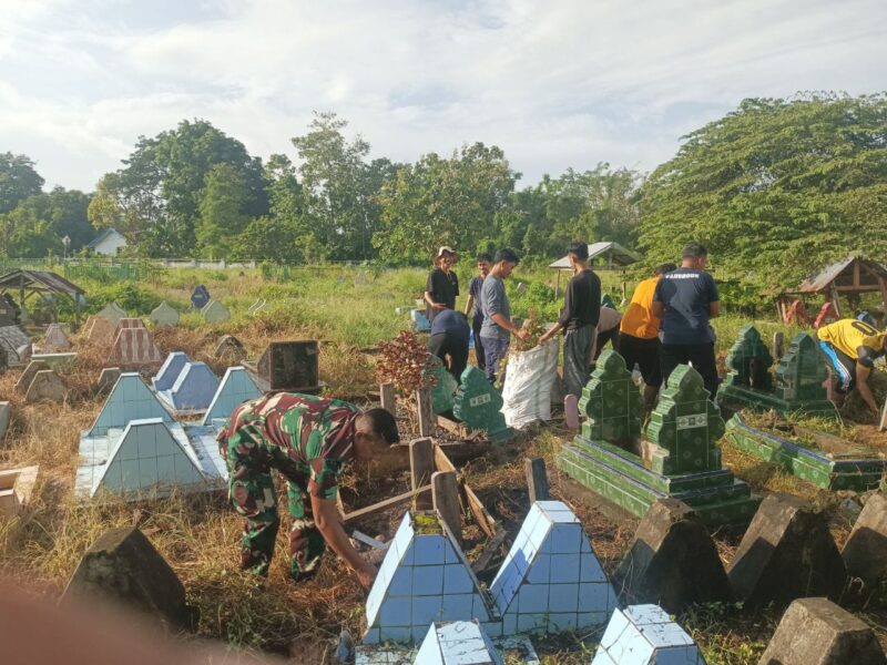 Peduli Kebersihan, Babinsa Ajak Perangkat Desa Dan Masyarakat Bersihkan Pekuburan Islam