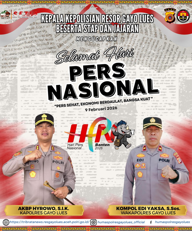 GAYO LUES | Kepolisian Resor Gayo Lues menyampaikan ucapan selamat Hari Pers Nasional (HPN) yang diperingati setiap tanggal 9 Februari. Dalam momentum HPN 2026 bertajuk “Pers Sehat, Ekonomi Berdaulat, Bangsa Kuat”, Kepolisian Resor setempat menegaskan pentingnya sinergi antara kepolisian dan insan pers untuk bersama-sama menjaga stabilitas, memperkuat kebebasan berekspresi, dan membangun iklim demokrasi yang sehat di tengah dinamika sosial yang terus berkembang.