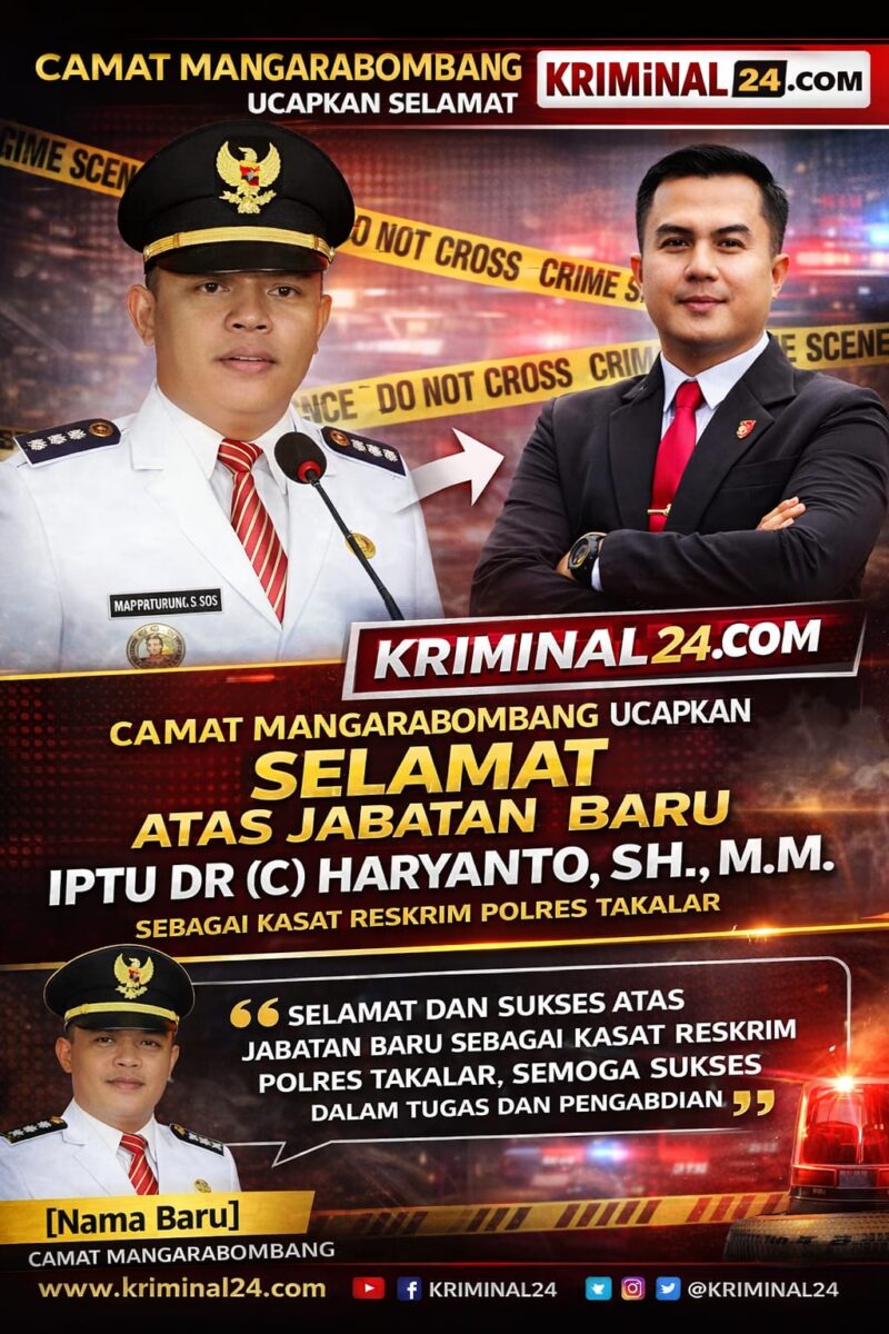 Takalar – Kriminal24.com | Camat Mangarabombang, Mappaturung, S.Sos., menyampaikan ucapan selamat kepada IPTU Dr(C) Haryanto, S.H., M.M atas amanah jabatan barunya sebagai Kepala Satuan Reserse Kriminal (Kasat Reskrim) Polres Takalar.