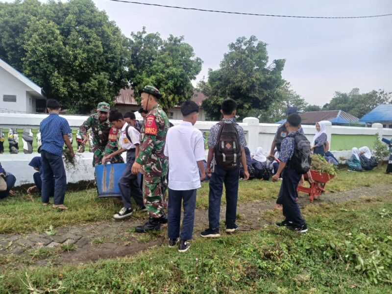 “Alhamdulillah kita sehat semua. Hari ini kita belajar kerja ikhlas. Sekolah bersih itu ibadah. Kalian sapu halaman, sama pahalanya dengan belajar di kelas,” pesan Kapten Ashar ke para siswa sebelum kerja dimulai.